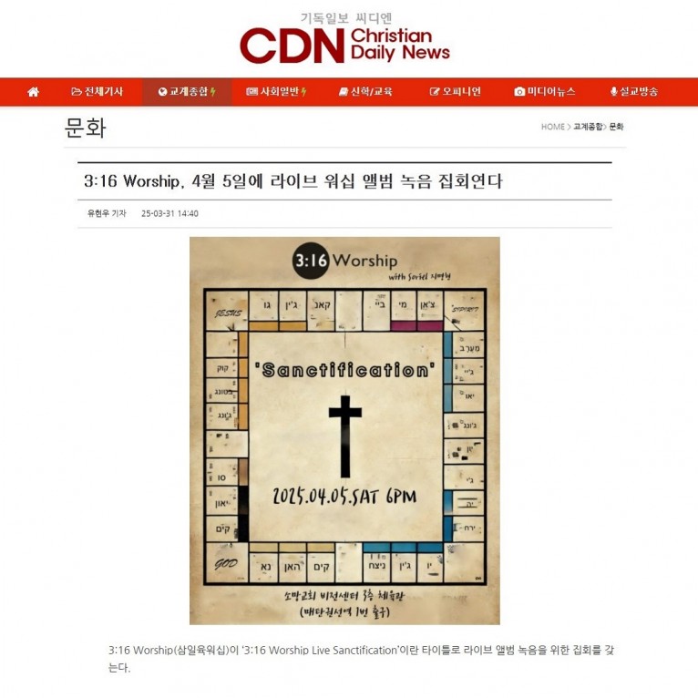 [기사] 3:16 Worship, 4월 5일에 라이브 워십 앨범 녹음 집회연다(기독일보 씨디엔)